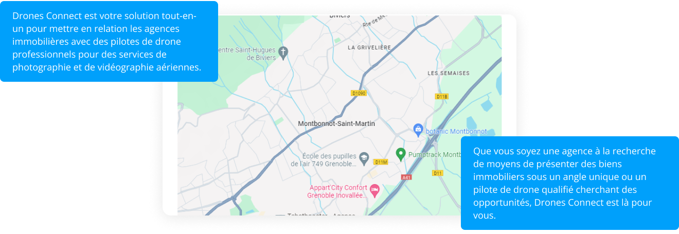 Que vous soyez une agence à la recherche de moyens de présenter des biens immobiliers sous un angle unique ou un pilote de drone qualifié cherchant des opportunités, Drones Connect est là pour vous.